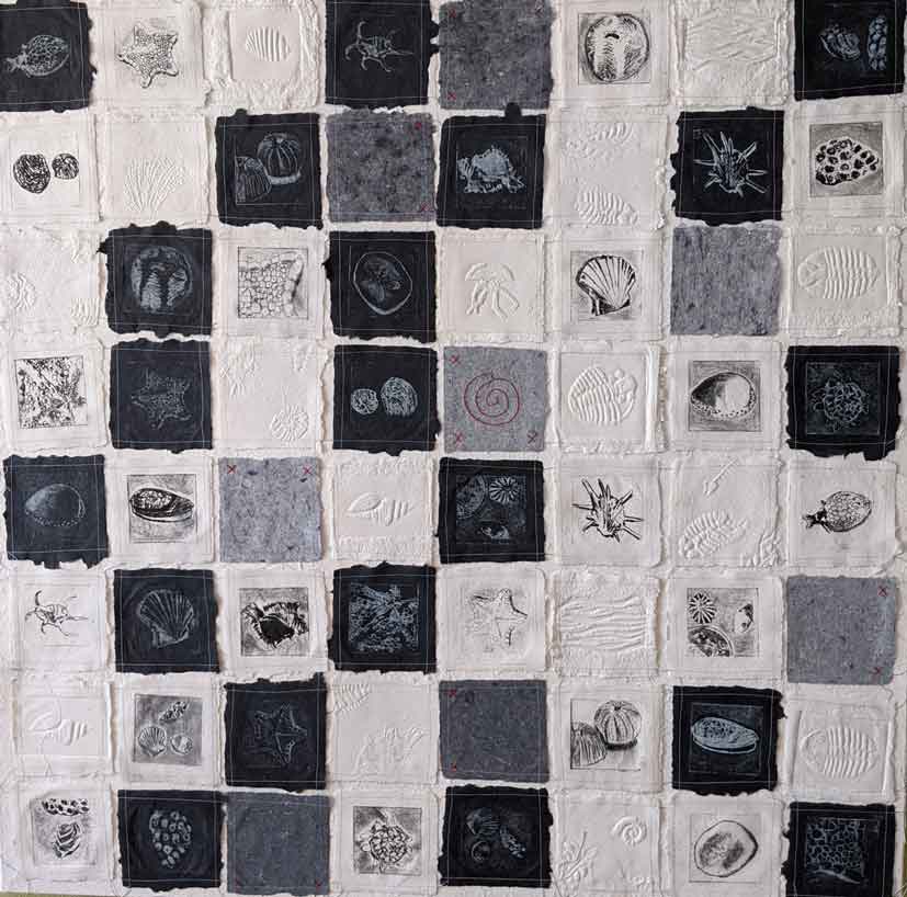Etchings and embossings on handmade paper from recycled archival board and hemp sewn together and to canvas 91 x 91cm