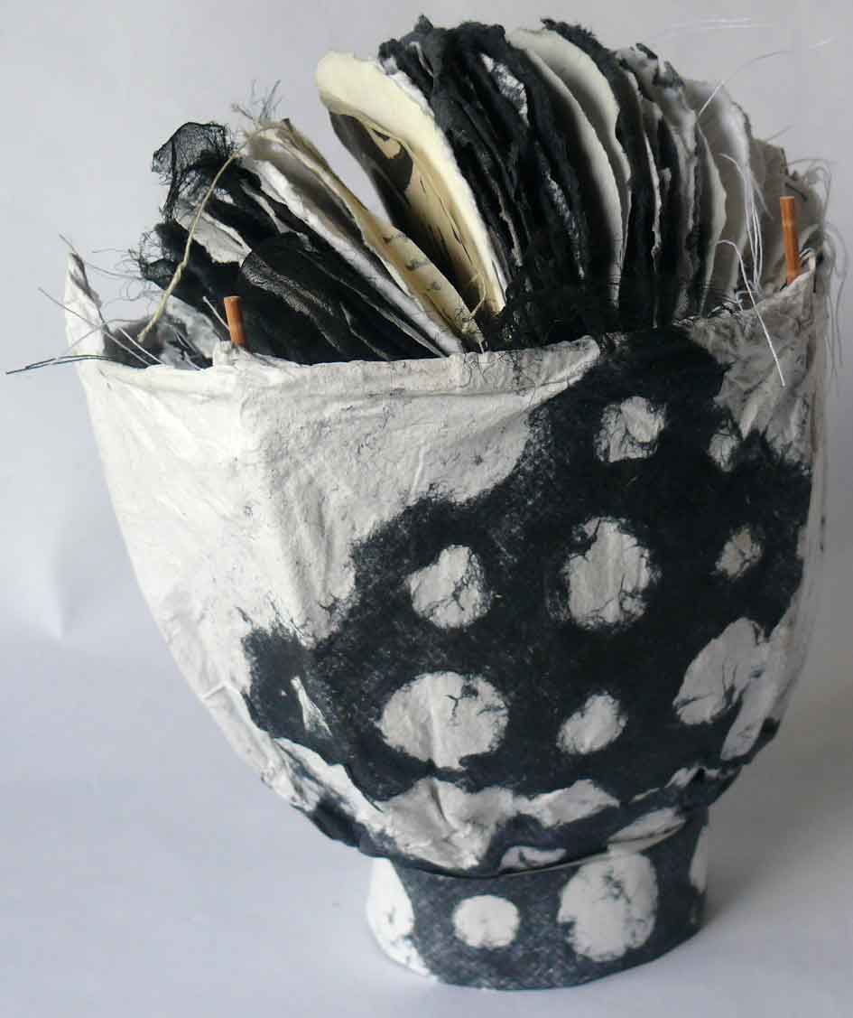 Paper is Music Work produced to fit inside a black stationery box as part of the Paper is Exhibition. The papers used were Bangladesh hemp and well beaten abaca the abaca was stretched over a cardboard form to produce the skin of the drum. A mix of the hemp and abaca was used to make string and the beads for beating the drum.