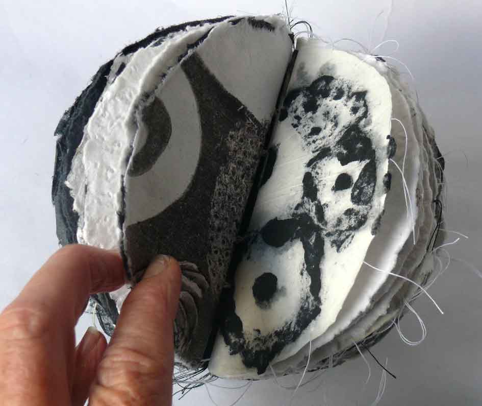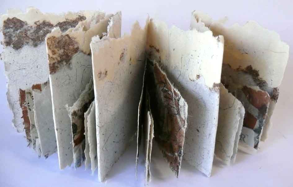 Connect is part of a suite of artist books around the theme of connection all featuring in some way gelatine prints and handmade paper. Nature is a constant source of inspiration for me and each of the prints has leaves and thread. The text contained in Connect derives from a saying by John Muir, a famous Scottish-American environmentalist and writer. The base concertina is pulp painted with a mixture of reconstituted abaca paper and plant fibre papers to give the idea of a landscape. It was made from several overlapping sheets of freshly formed paper rolled onto a sheet of fibro cement thus making one long sheet. The internal sheets are handmade recycled and plant fibre, tissue paper and gampi and the text was printed using stamps and a stamp pad.