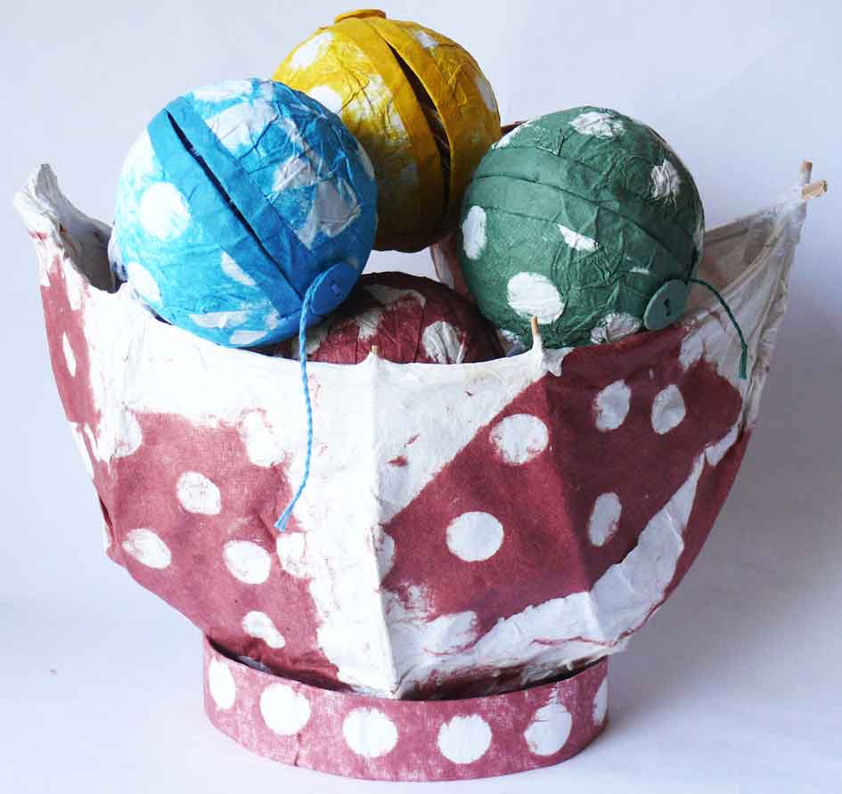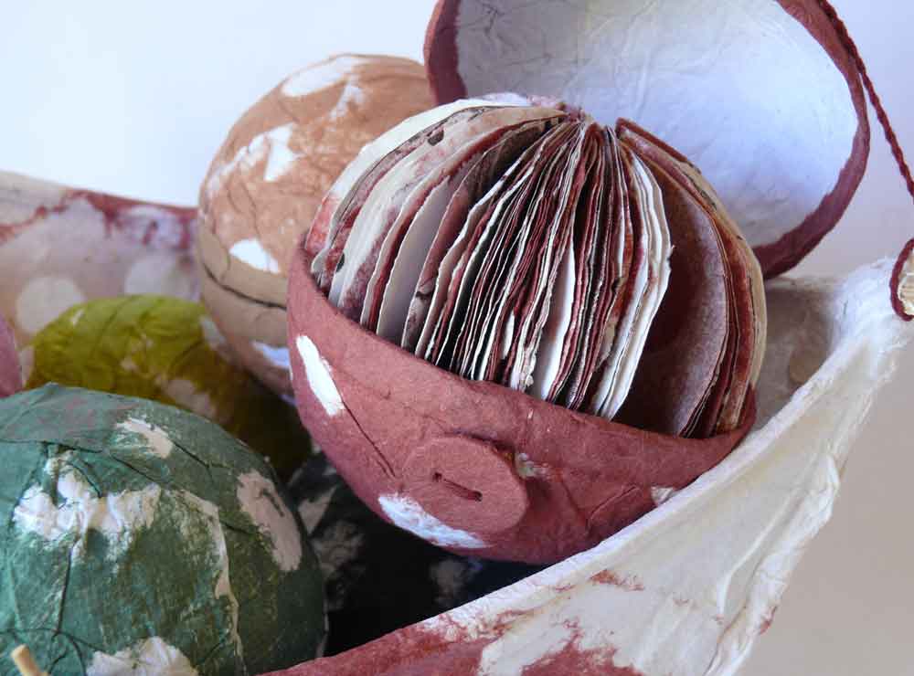 Paper is: Circulation 2016-7 Handmade papers with pulp painting and gelatine prints bound using Coptic stitch encsed in spherical slip cases and sitting in a case made from cane and pulp painted handmade hemp paper.