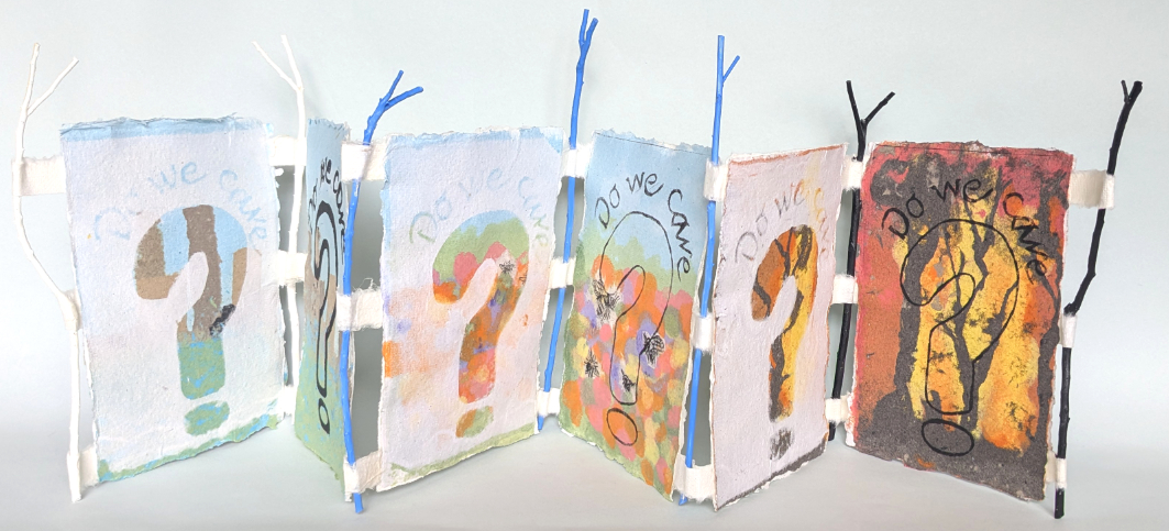Conservation Conversations began with the artist’s observation of the close relationship between the words conservation and conversation. This connection forms the foundation of the work, reflecting the belief that care for the natural world begins with listening, speaking, and exchanging ideas. Drawing on the words of environmentalists such as John Muir and Greta Thunberg, alongside personal reflections, the work invites dialogue about humanity’s relationship with the environment. Handmade paper, thread, eco-printed Hahnemühle, and drypoint prints of bees on kozo embed the textures and fragility of nature within the piece, while highlighting the essential role bees play in sustaining life. The materials themselves become part of the conversation, evoking cycles of growth, loss, and renewal. By weaving text and material together, the works encourage reflection on shared responsibility and collective care, inviting viewers to pause, listen, and engage in the ongoing conversation of conservation.