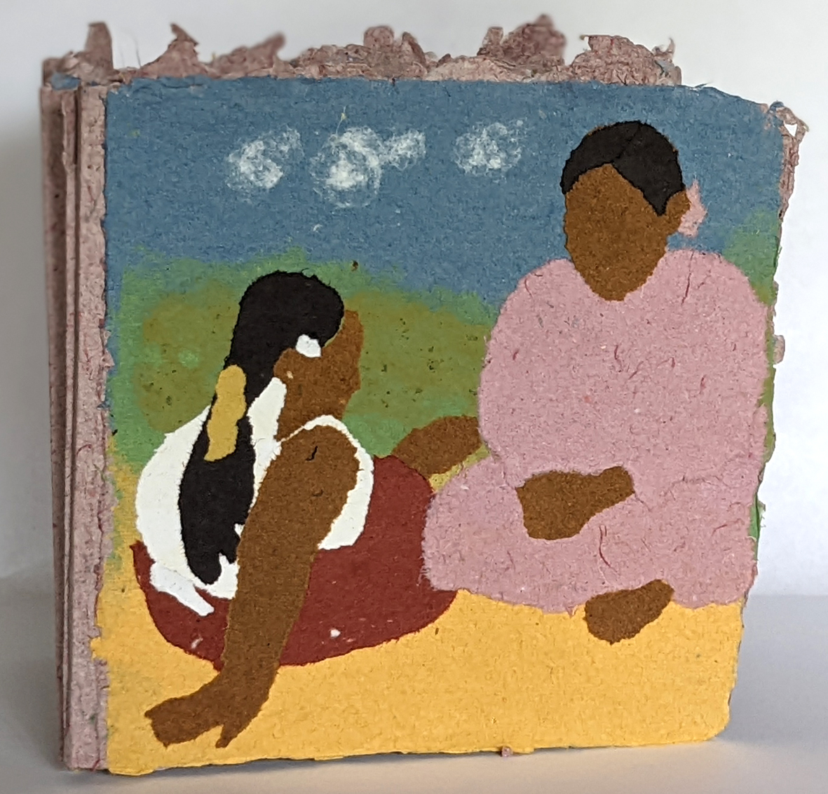 Inspired by the book of short stories ‘The Burnished Sun’ by Mirandi Riwoe, I chose to include reference to Paul Gaugin who is a character in one of the stories. I found the stories to reflect the trauma of many of the women involved, several having been abducted from their island homes and taken to the other side of the world. These crimes were hidden at the time. I made a tunnel book as a way to show that the historical truth was hidden. The cover shows Gauguin's 'Tahitian Women 1891', that depicts two Tahitians, one in traditional clothing facing away, the other in missionary clothing. Once the book is opened, the viewer looks through idyllic palm trees which obscure the final image, a rendition of ‘The Scream”, demonstrating the emotional impact of the stories in the novel.