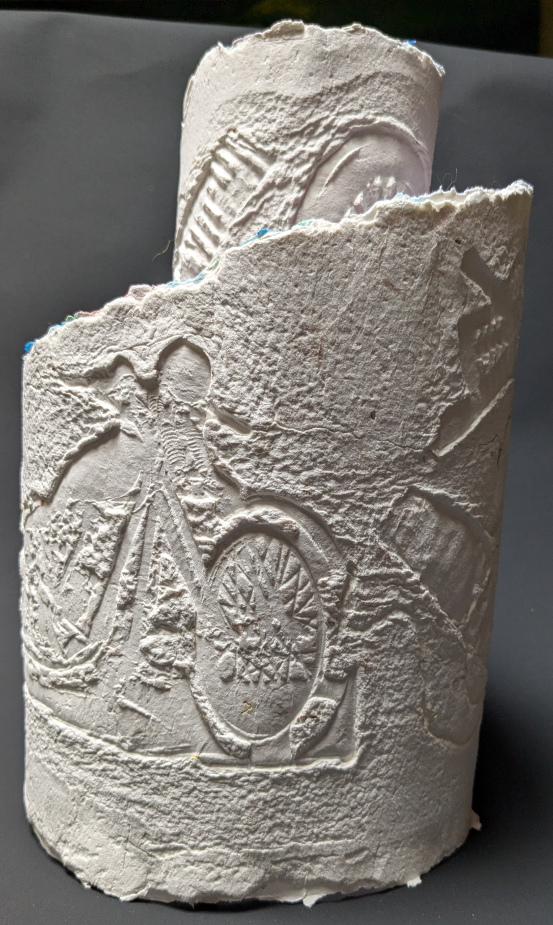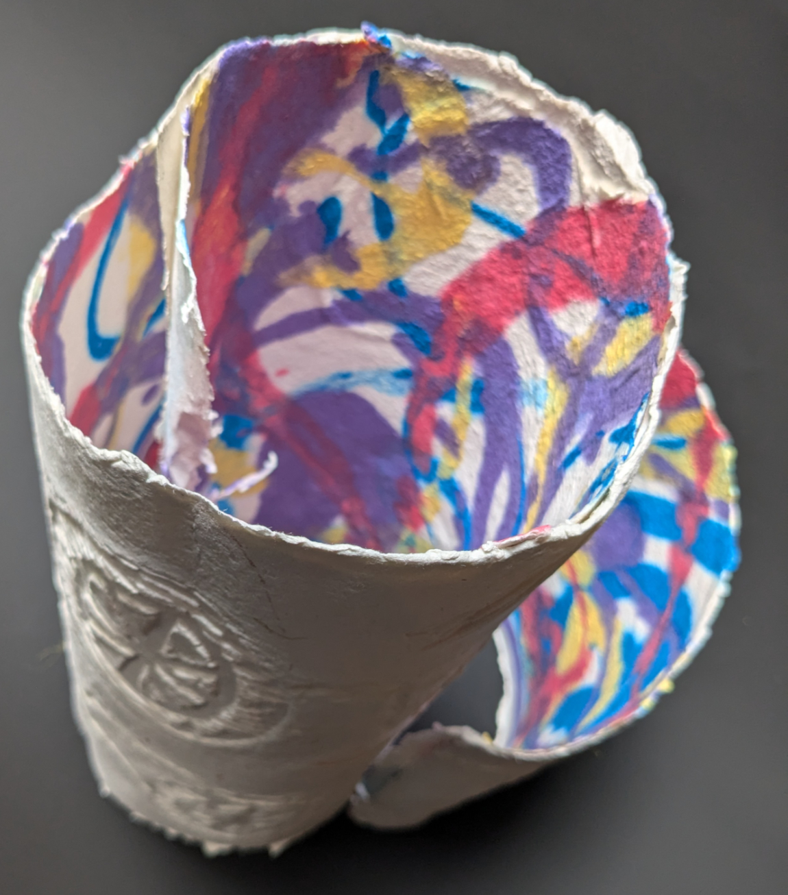 Pulp painting and print with mulberry sticks. This book questions both our future and the lack of concern exhibited by many in our society.