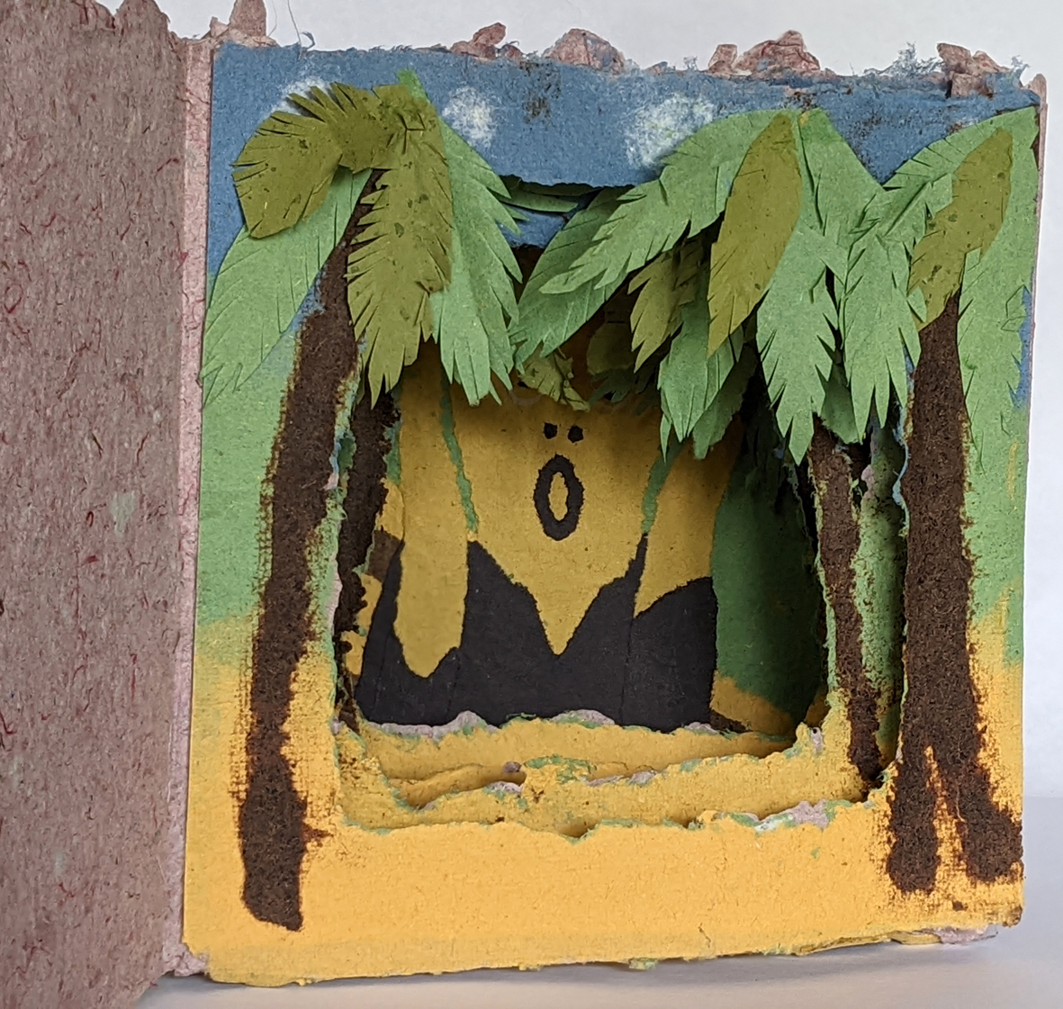Inspired by the book of short stories ‘The Burnished Sun’ by Mirandi Riwoe, I chose to include reference to Paul Gaugin who is a character in one of the stories. I found the stories to reflect the trauma of many of the women involved, several having been abducted from their island homes and taken to the other side of the world. These crimes were hidden at the time. I made a tunnel book as a way to show that the historical truth was hidden. The cover shows Gauguin's 'Tahitian Women 1891', that depicts two Tahitians, one in traditional clothing facing away, the other in missionary clothing. Once the book is opened, the viewer looks through idyllic palm trees which obscure the final image, a rendition of ‘The Scream”, demonstrating the emotional impact of the stories in the novel.
